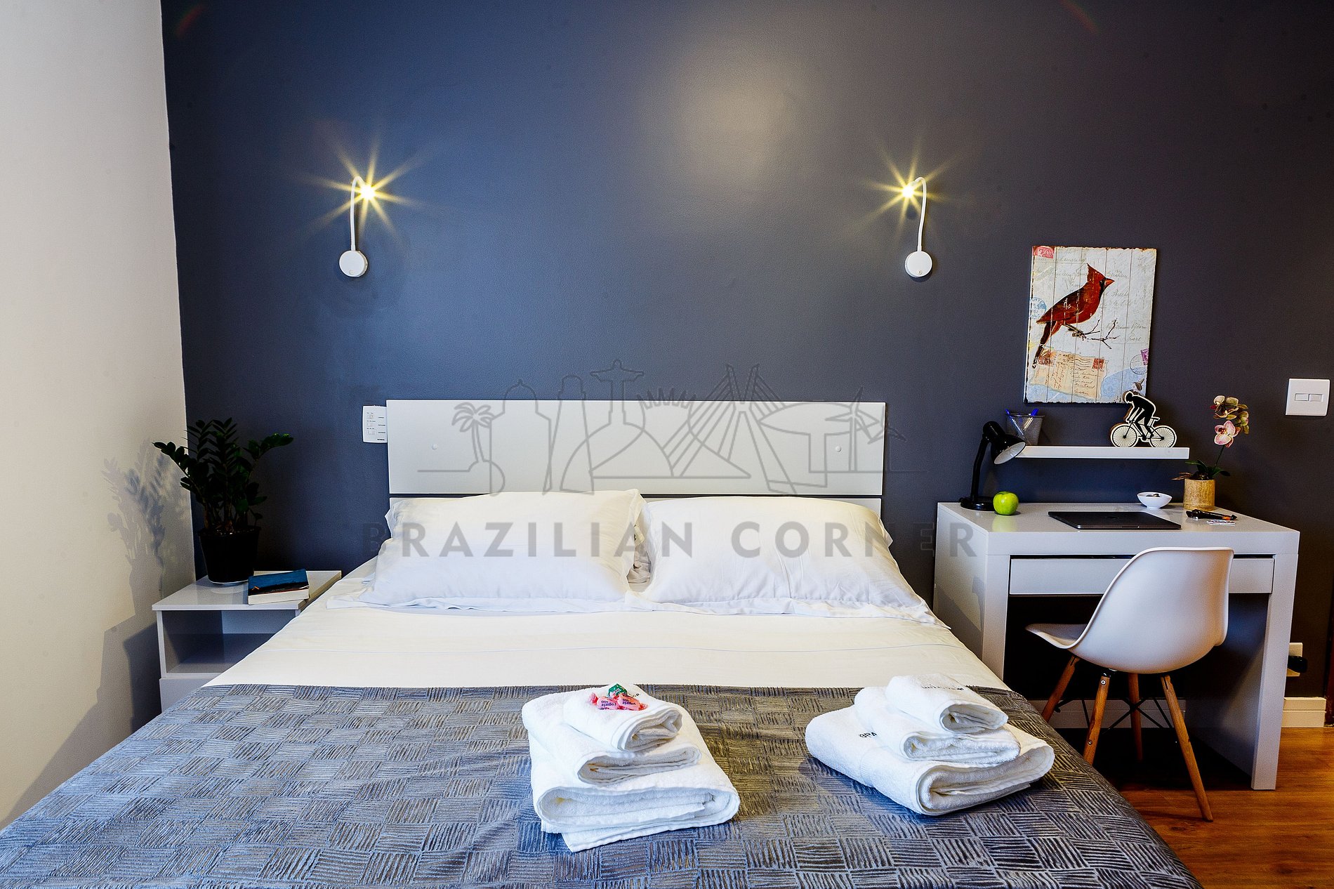 This cozy suite is located in Alto de Pinheiros, a prestigious and culturally rich neighborhood. It offers the ideal space for a stay in the city of São Paulo. It is very well-equipped with a queen-size bed, sofa bed, Smart TV, ceiling fan, digital lock, work desk, a private bathroom with hairdryer, and a gas shower. Additionally, the suite has access to a shared kitchen, but each room has its own cupboard with dishes and a private minibar for exclusive use.
