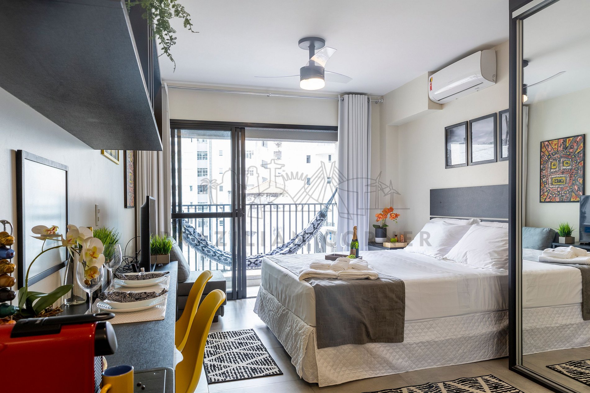 The 35m² studio is located near Republica metro station (integrated with Red Line 3 and Yellow Line 4), offering the ideal space for a comfortable stay in São Paulo. It features a 43" SmartTV, air conditioning, blackout curtains, ultra-fast internet, a fully-equipped kitchen with a Nespresso coffee machine, a bathroom with a hairdryer, and an excellent gas-powered shower. The building provides amenities such as a pool, gym, sauna, laundry facilities, and a parking space.