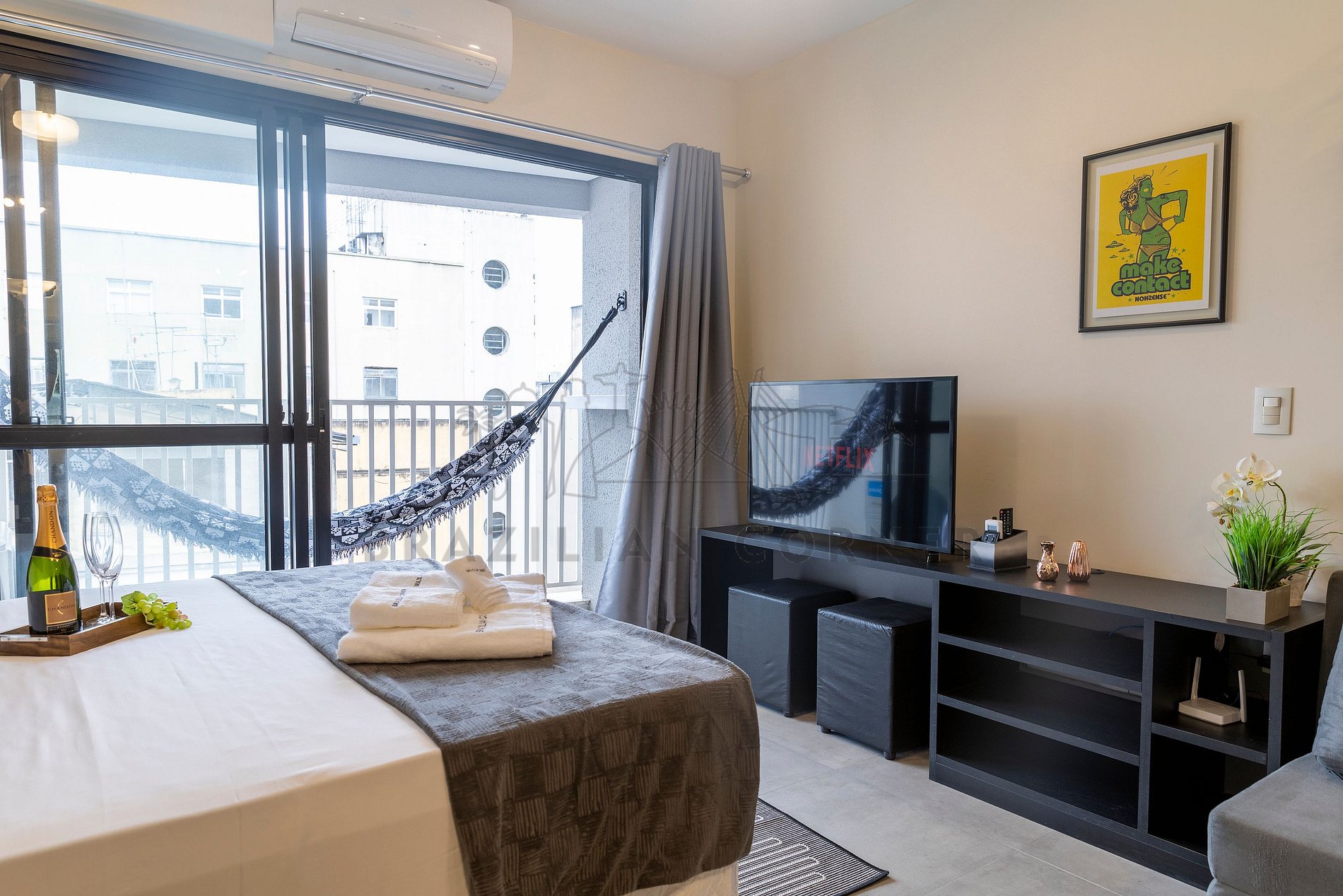 Property managed by the professional company Brazilian Corner, located near the Republic station(integrated with the 3-Red Line and 4-Yellow Line), is the ideal space for a comfortable stay in the city of São Paulo. It features a 43" SmartTV, air conditioning, blackout curtains, ultra-fast internet, a fully equipped kitchen with a Nespresso coffee machine, and a bathroom with a great gas shower. The building offers a pool, gym, sauna, laundry facilities, and a parking space for your convenience.