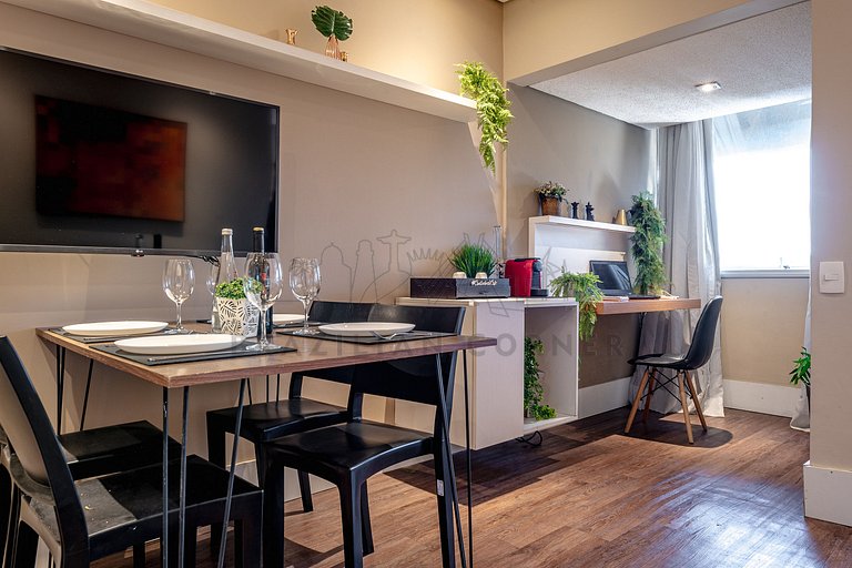 The cozy studio is strategically located in Itaim Bibi, only 650m away from Berrini train station (Line 9 - Esmeralda). Situated in an upscale neighborhood, it offers an ideal space for a stay in the city of São Paulo. The studio features air conditioning, a work desk, dining table, gas shower, ultra-fast internet, a comfortable King Size bed, sofa bed and a well-Equipped Kitchen . The building offers amenities such as a gym, restaurant, laundry, and paid parking.