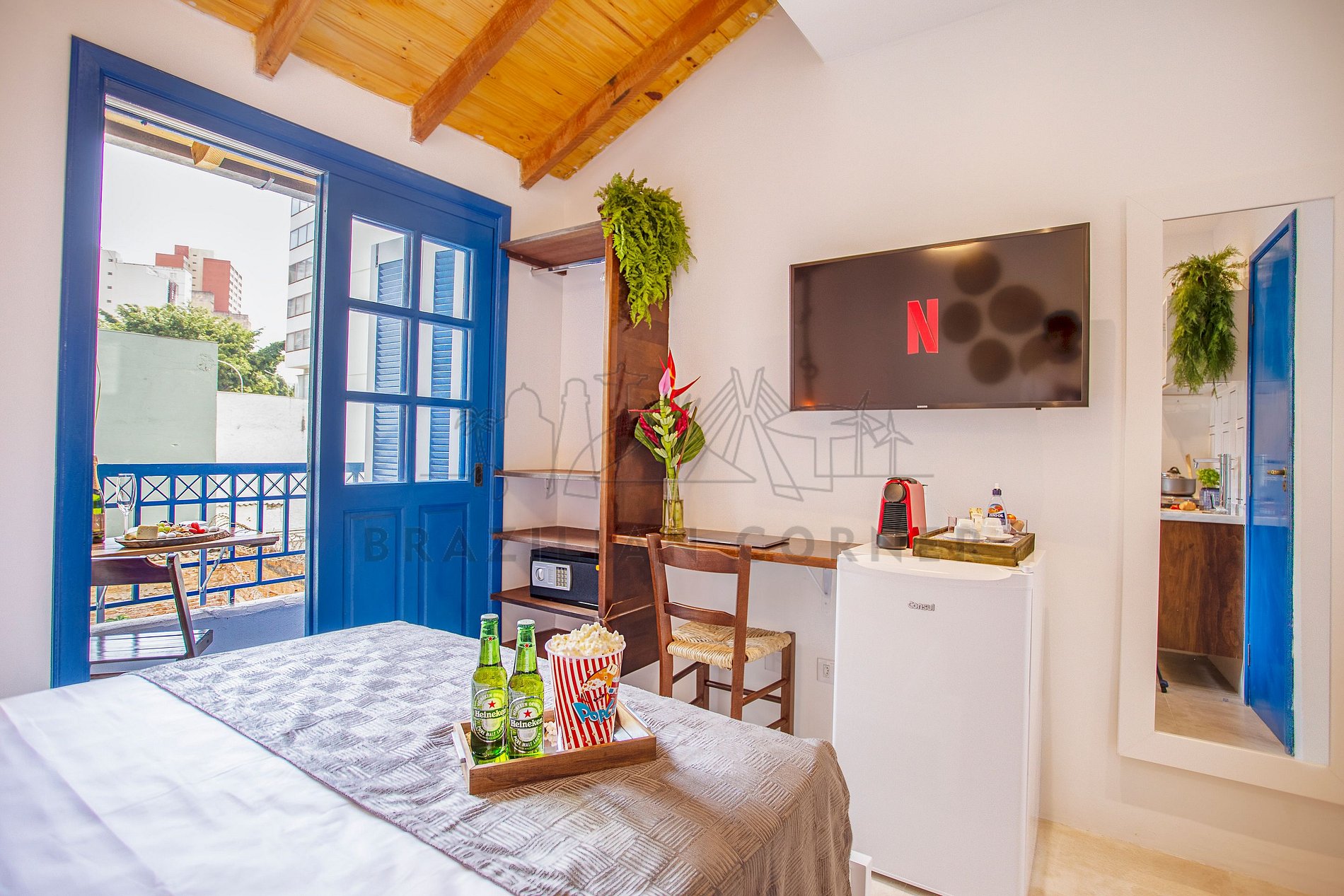 With Greek architecture, the studios are located in Higienópolis, an upscale neighborhood in São Paulo, close to Higienópolis subway station (Line 4 - Yellow), and near great local bars and restaurants. Featuring a beautiful garden and a pleasant solarium, the Mediterranean atmosphere of the building is a true oasis in the region, offering a unique experience. The properties are equipped with Smart TV, kitchen, workspace, ultra-fast internet, double bed, and ceiling fan.