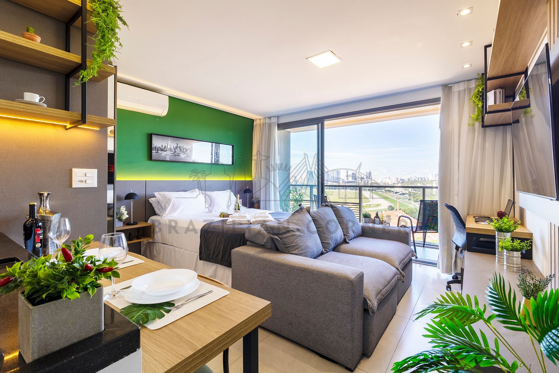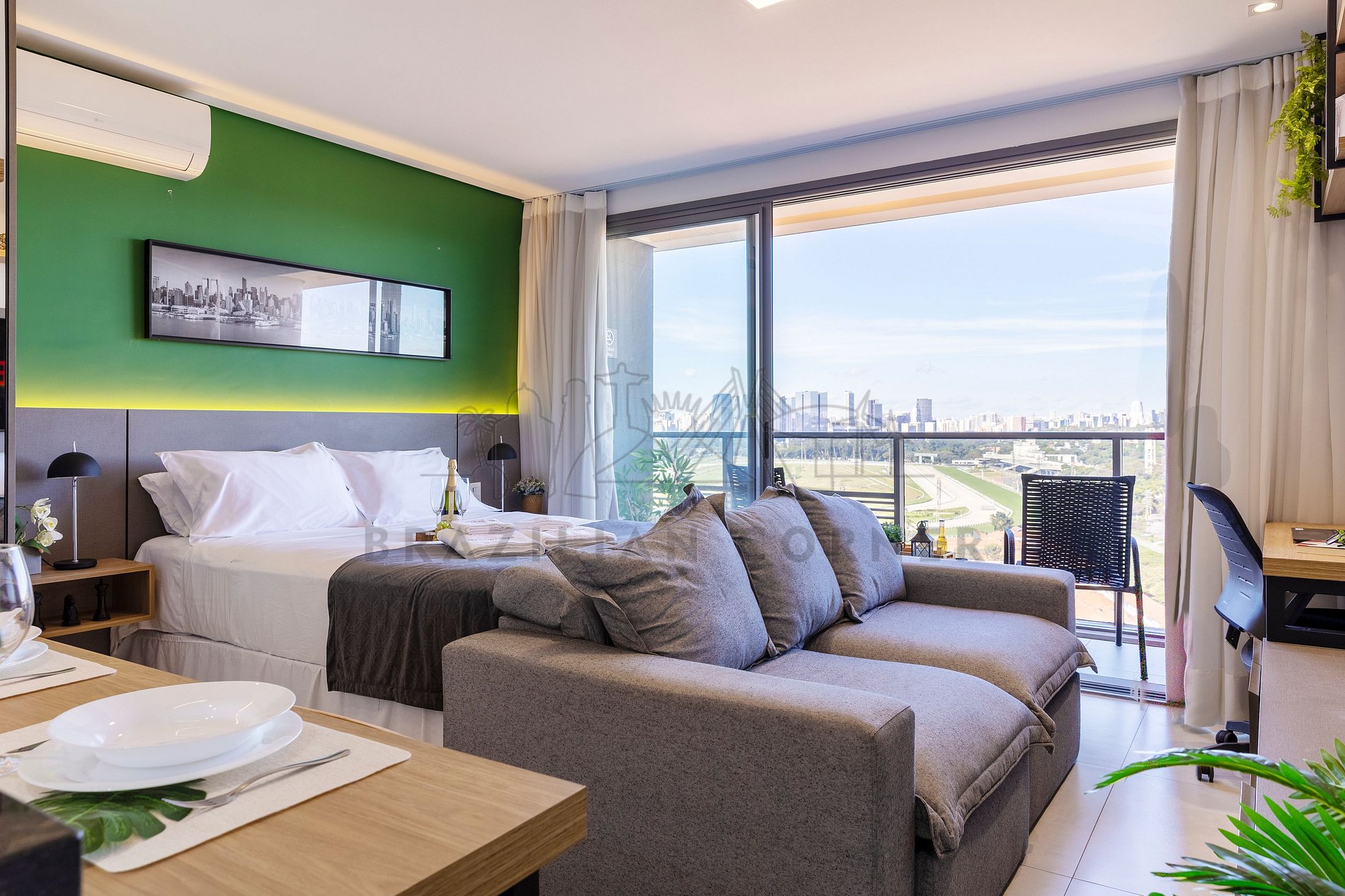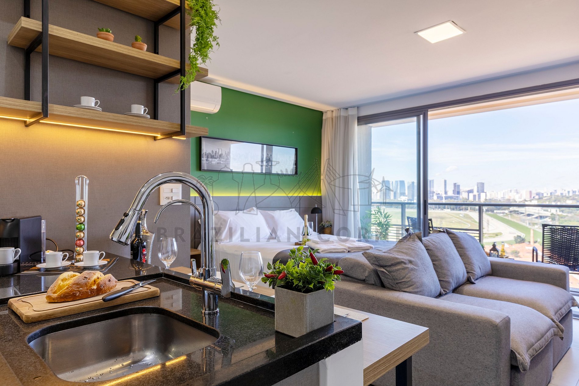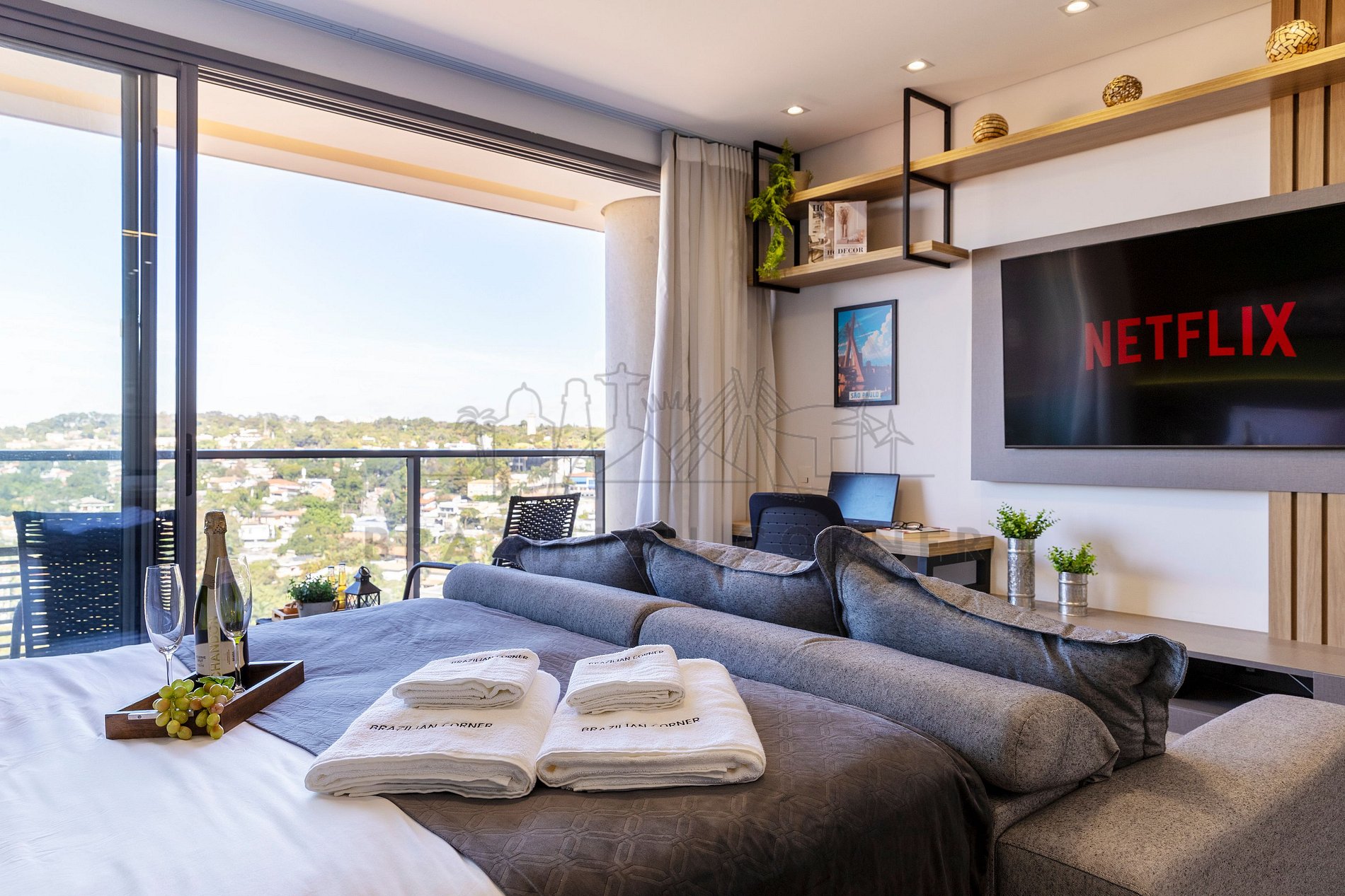 Located in front of the Jockey Club, just 800m from Butantã station (Line 4 - Yellow), the 30 m² studio overlooking the city has the ideal space for a season in São Paulo. It is well equipped with a queen size bed, sofa bed, 50" Smart TV, desk, ultra-fast internet, digital lock, air conditioning, blackout curtain, the bathroom has a gas shower, hair dryer and hygienic shower. In the building there is a parking space, gym, laundry and swimming pool.