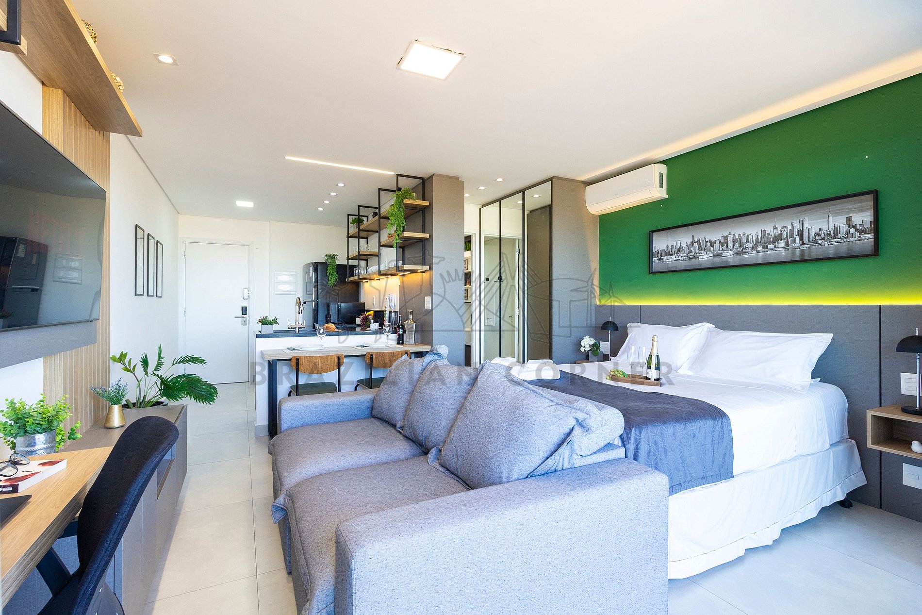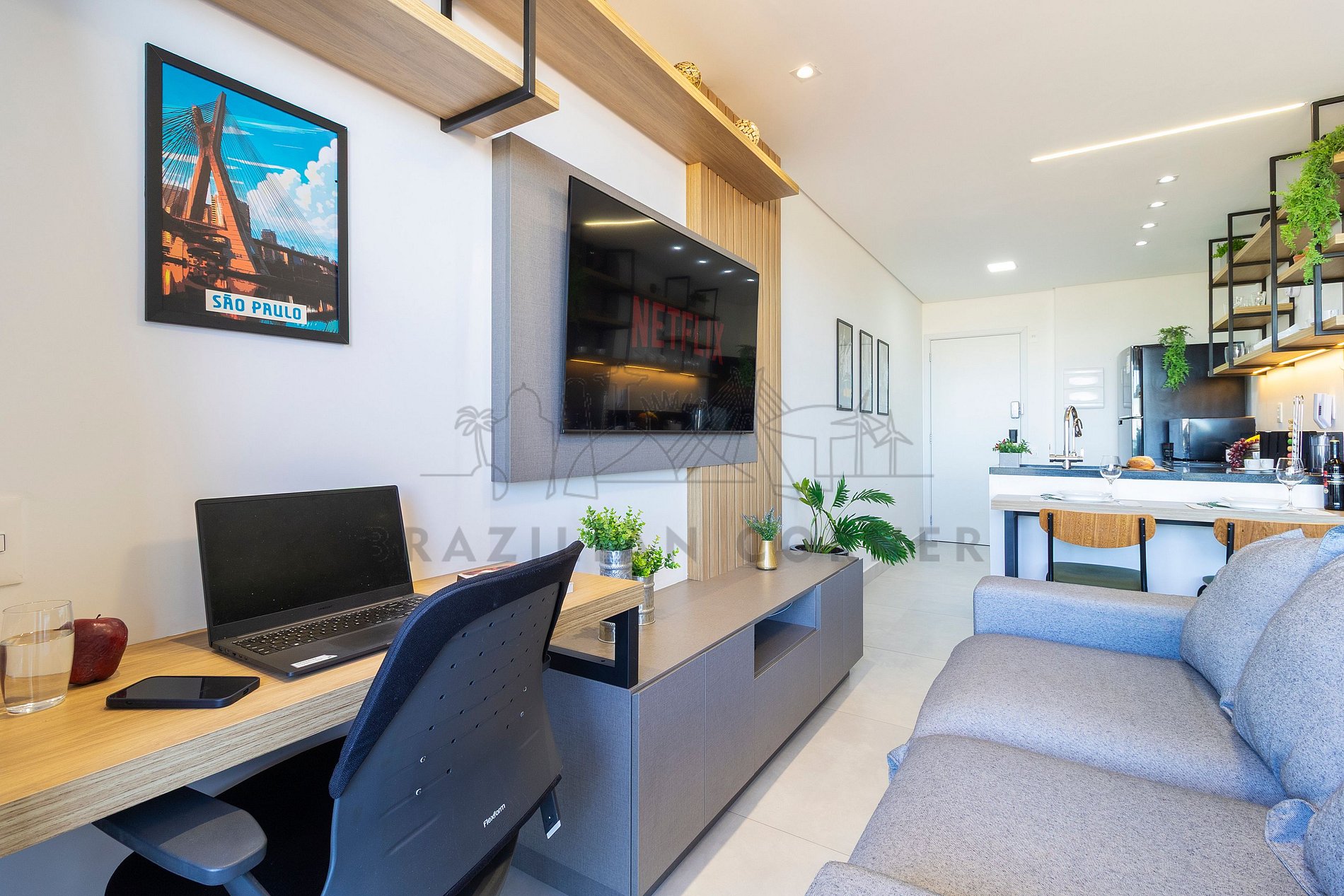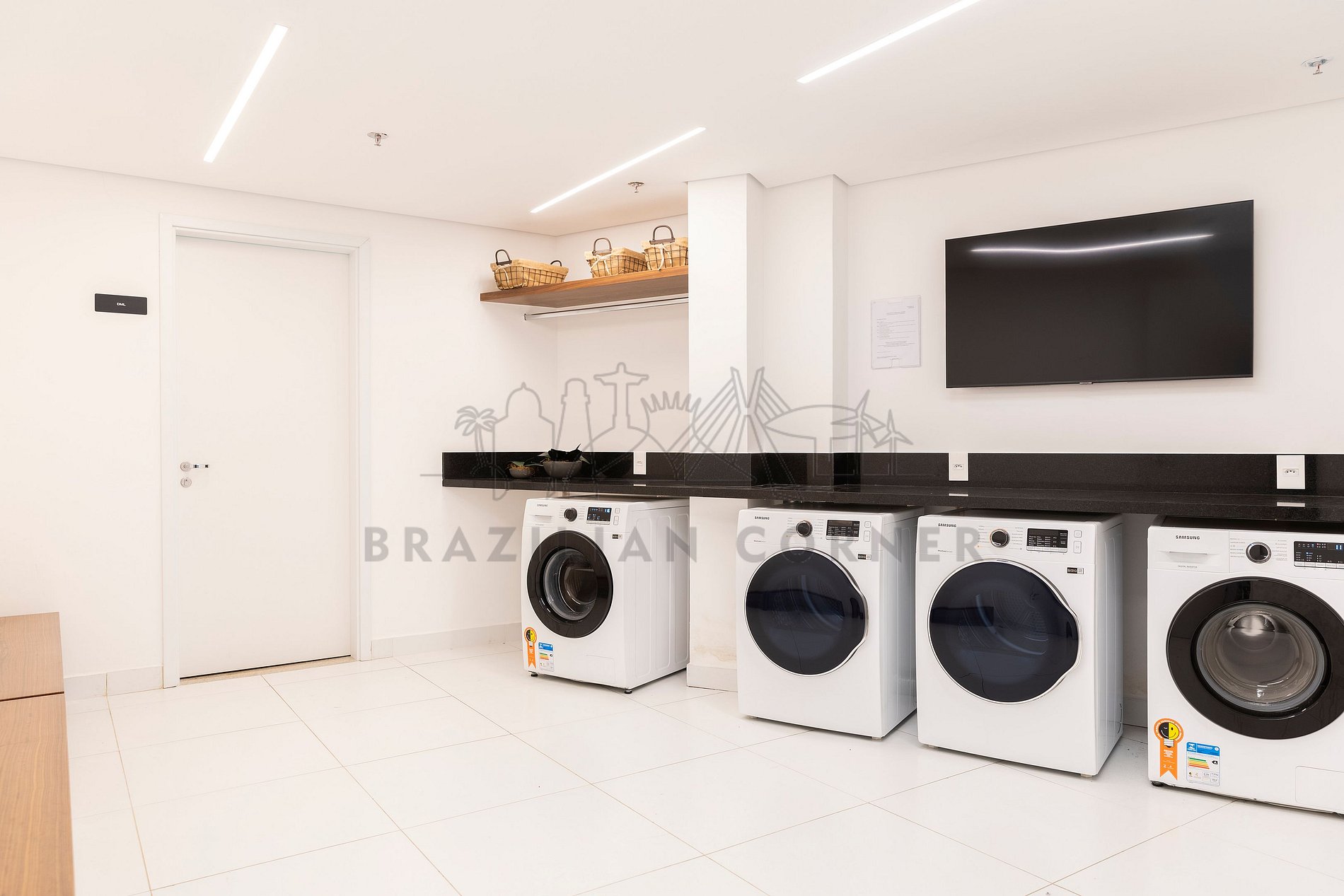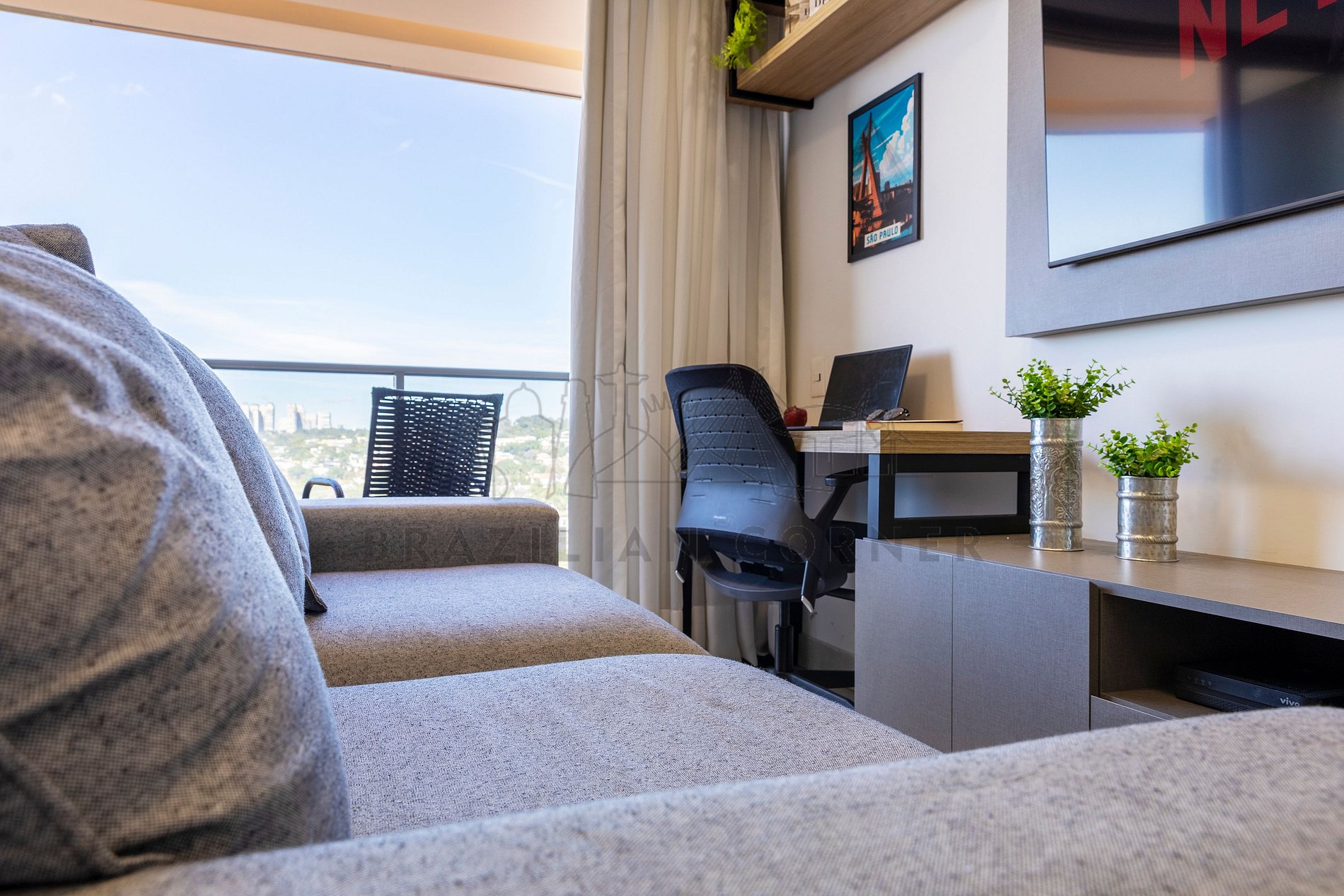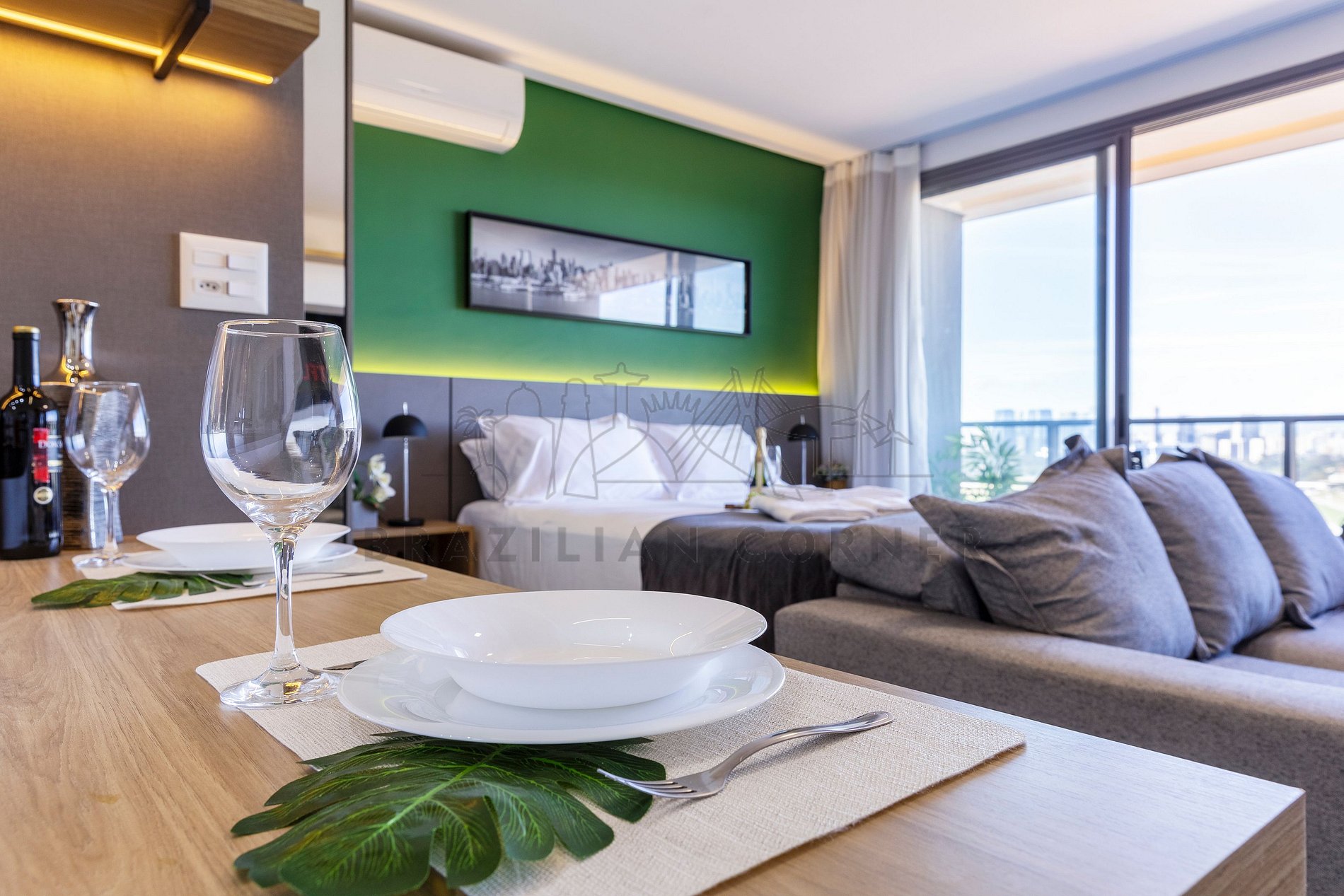 Located in front of the Jockey Club, just 800m from Butantã station (Line 4 - Yellow), the 30 m² studio overlooking the city has the ideal space for a season in São Paulo. It is well equipped with a queen size bed, sofa bed, 50" Smart TV, desk, ultra-fast internet, digital lock, air conditioning, blackout curtain, the bathroom has a gas shower, hair dryer and hygienic shower. In the building there is a parking space, gym, laundry and swimming pool.