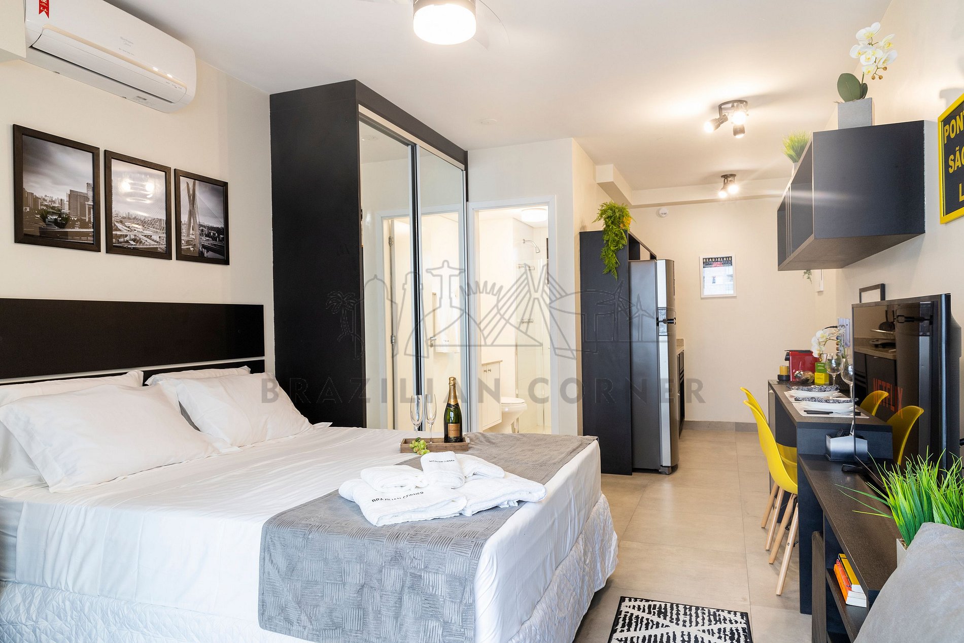 O prédio moderno fica próximo ao metrô da República (integrada com a linha 3 Vermelha e linha 4 Amarela). Os estúdios são bem equipados com Smart TV de 43", ar condicionado, cortina blackout, internet ultra-veloz, fechadura digital, cozinha completa com cafeteira Nespresso e banheiro com secador de cabelo e chuveiro a gás. O edifício disponibiliza piscina, academia, sauna, lavanderia, um mercadinho e vaga de garagem para a sua comodidade.