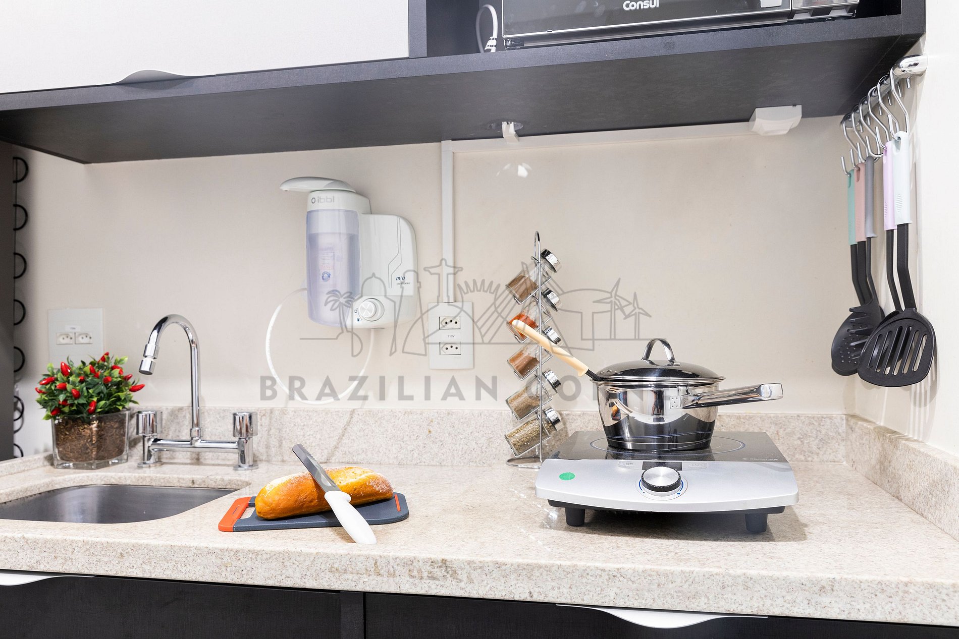 - Fogão: Sinta-se em casa na nossa cozinha, completa com um moderno fogão, proporcionando a flexibilidade para preparar suas refeições favoritas. Seja um mestre culinário ou alguém que gosta de experimentar novos sabores, você terá tudo o que precisa à sua disposição.
