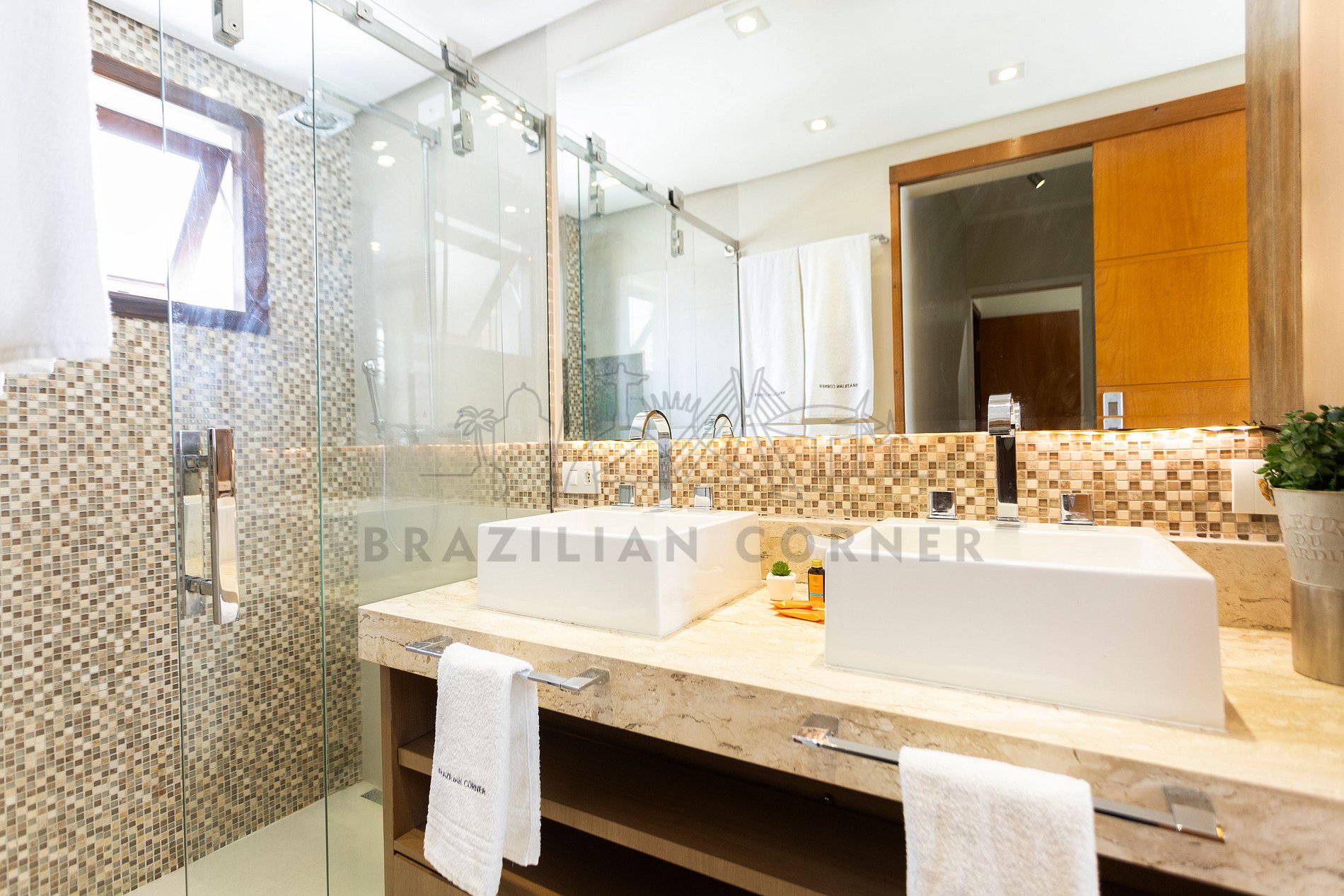 Nosso imóvel conta com 3 banheiros nas suítes e 2 lavabos que foram cuidadosamente decorados e mobiliados. Oferecendo privacidade e praticidade.