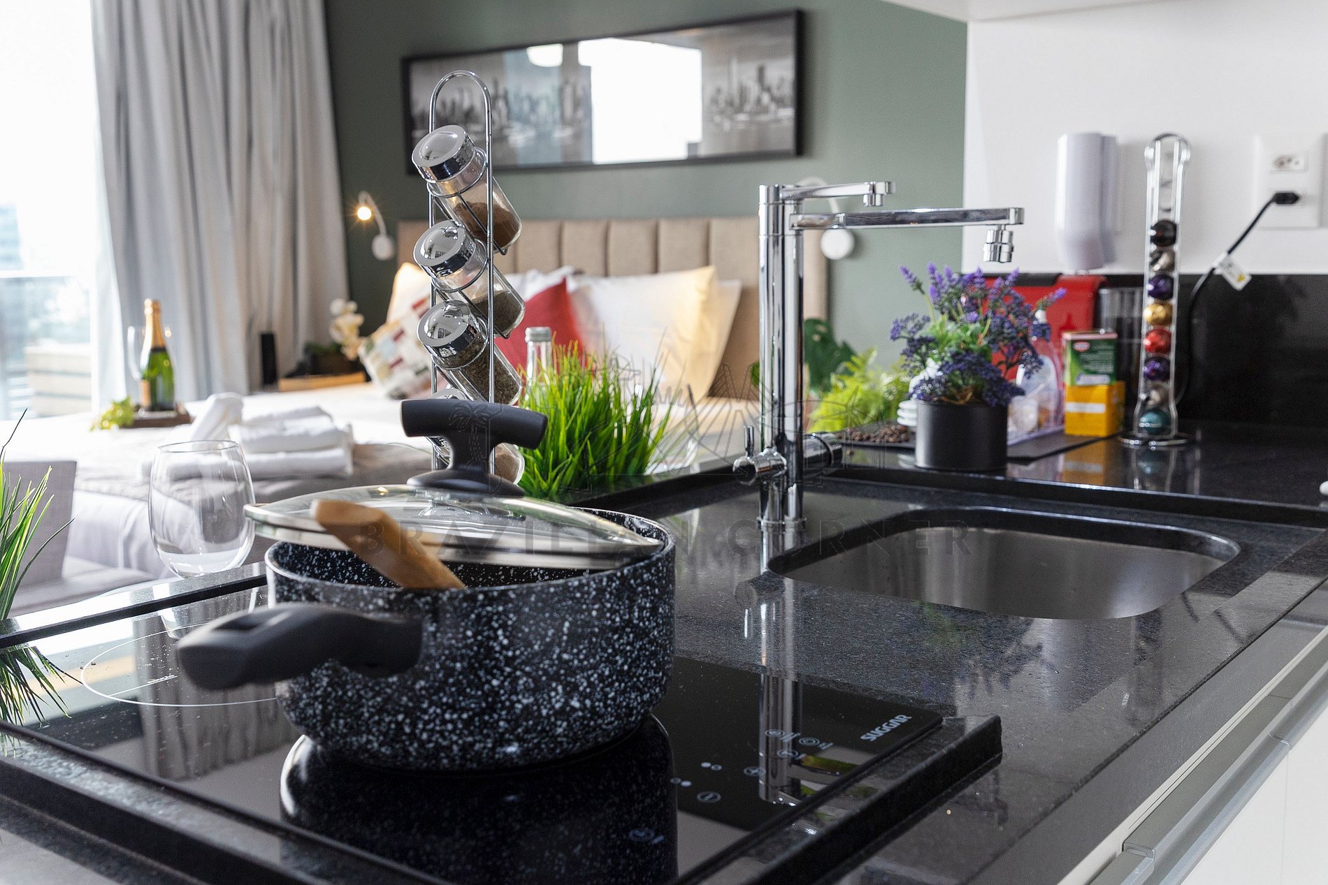 - Fogão: Sinta-se em casa na nossa cozinha, completa com um moderno fogão, proporcionando a flexibilidade para preparar suas refeições favoritas. Seja um mestre culinário ou alguém que gosta de experimentar novos sabores, você terá tudo o que precisa à sua disposição.
