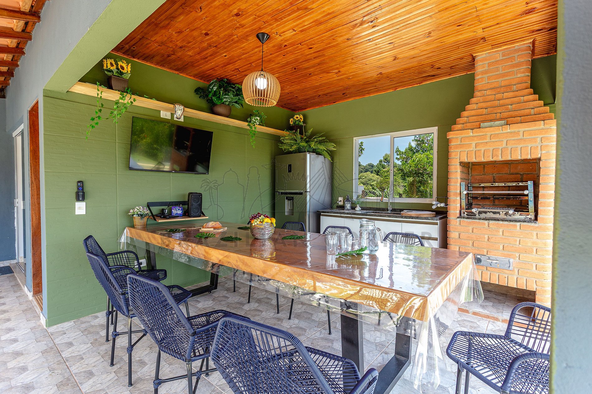 - Varanda com Cadeira e Mesa: Aproveite momentos relaxantes ao ar livre em nossa varanda, com uma mesa para 9 pessoas, desfrute de uma xícara de café da manhã, leia um livro, curta a família ou simplesmente aprecie a paisagem ao seu redor.