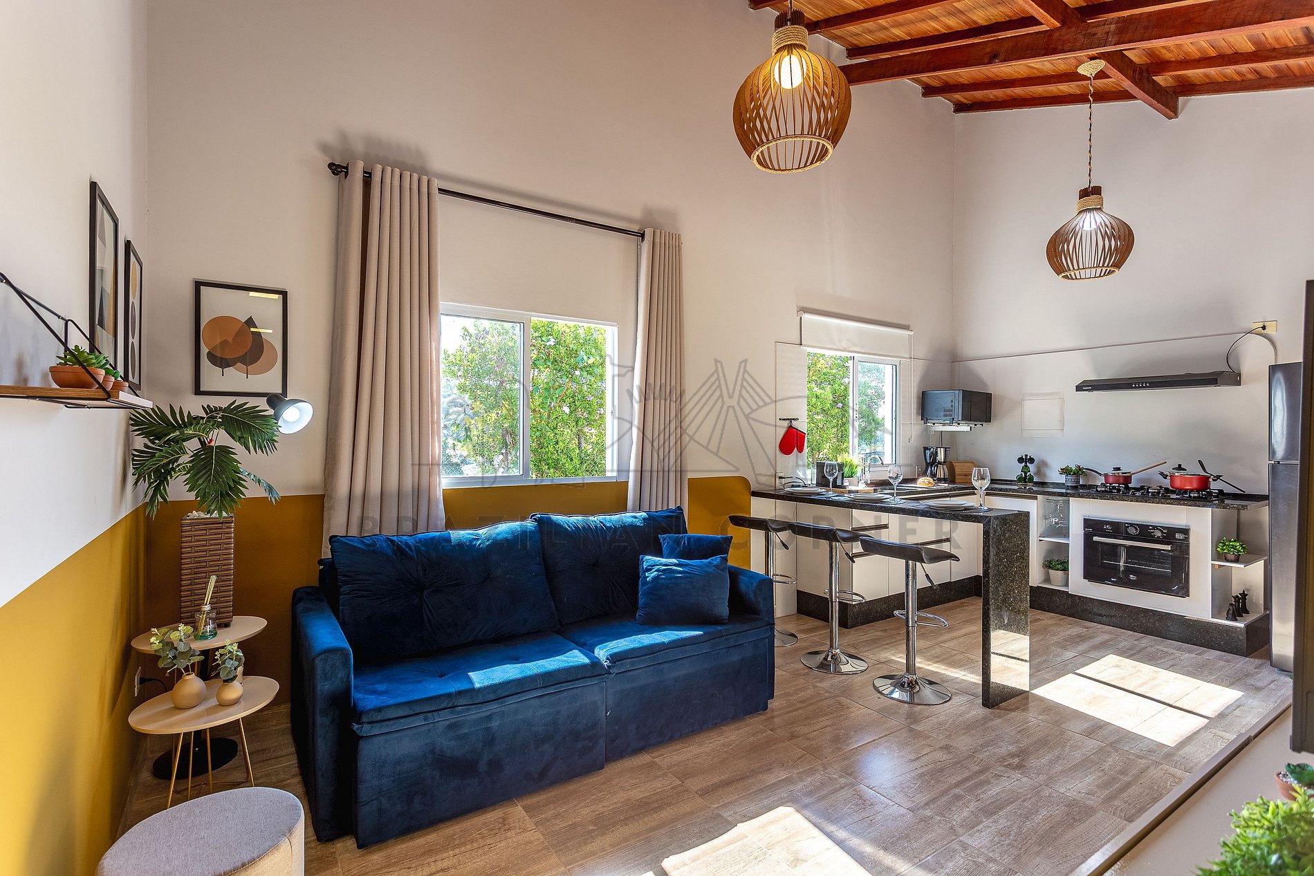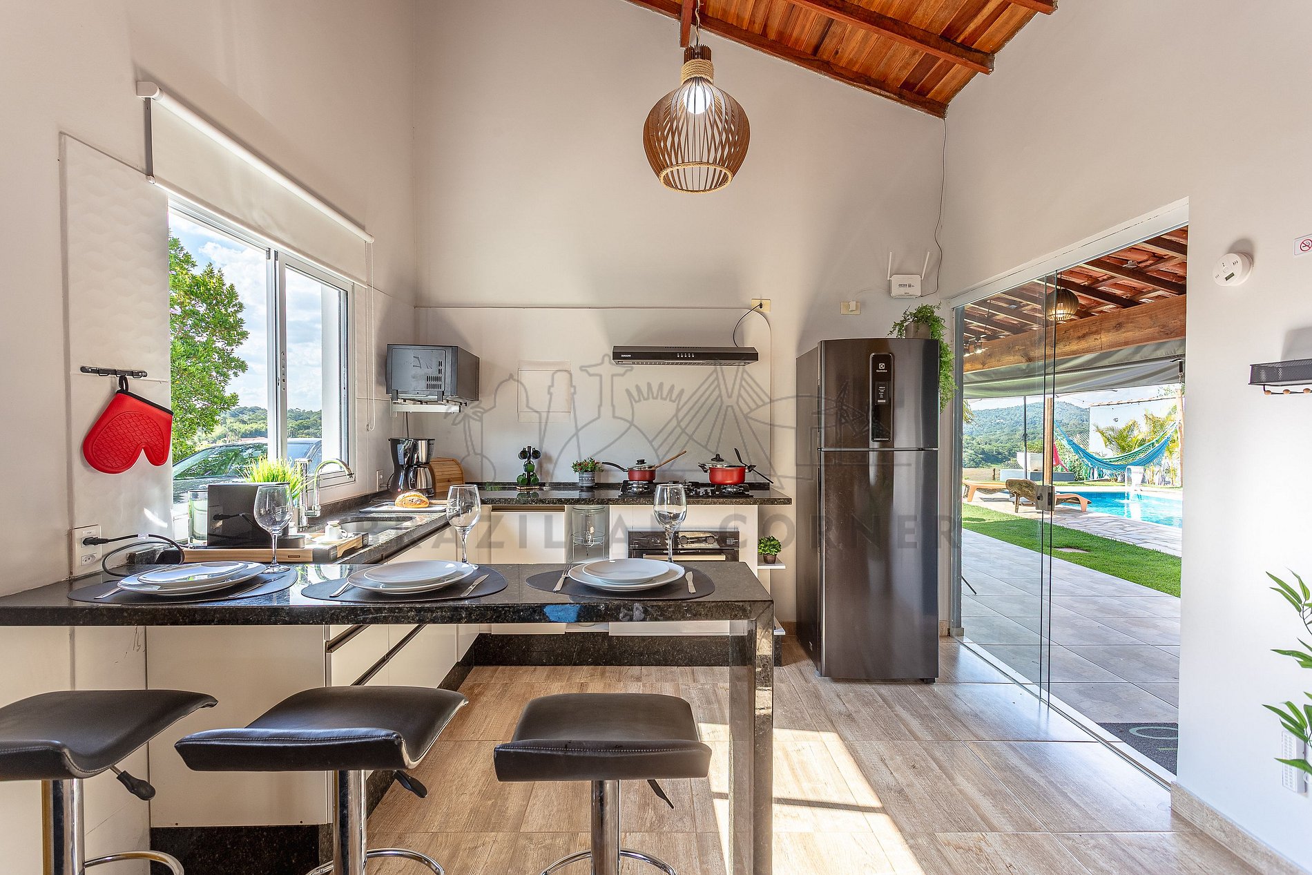- Bancada para 3 pessoas: compartilhe momentos especiais durante sua estadia em torno de uma bancada aconchegante. Nosso espaço comporta até 3 pessoas, proporcionando um ambiente perfeito para refeições memoráveis.
