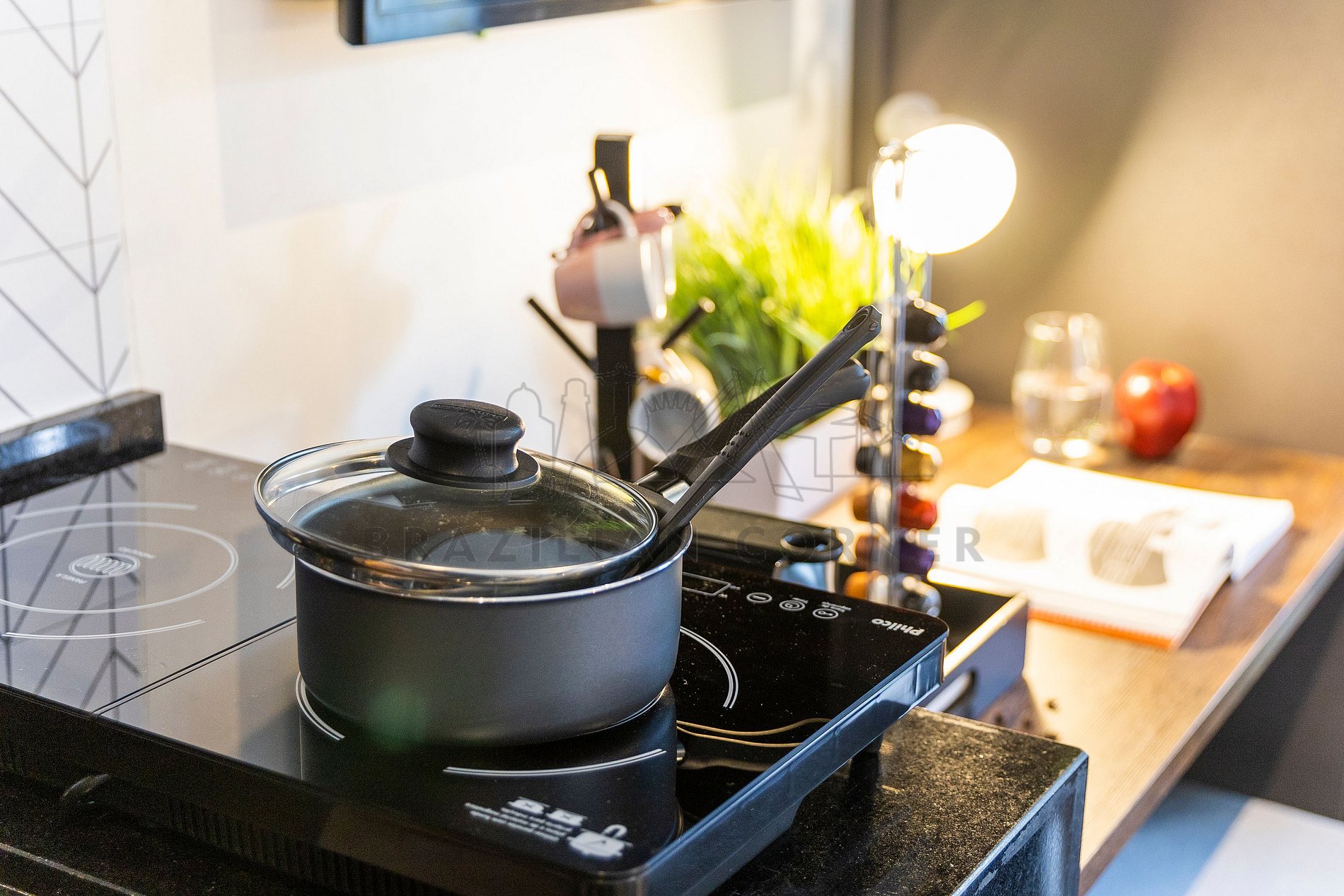 - Fogão: Sinta-se em casa na nossa cozinha, completa com um moderno fogão, proporcionando a flexibilidade para preparar suas refeições favoritas. Seja um mestre culinário ou alguém que gosta de experimentar novos sabores, você terá tudo o que precisa à sua disposição.