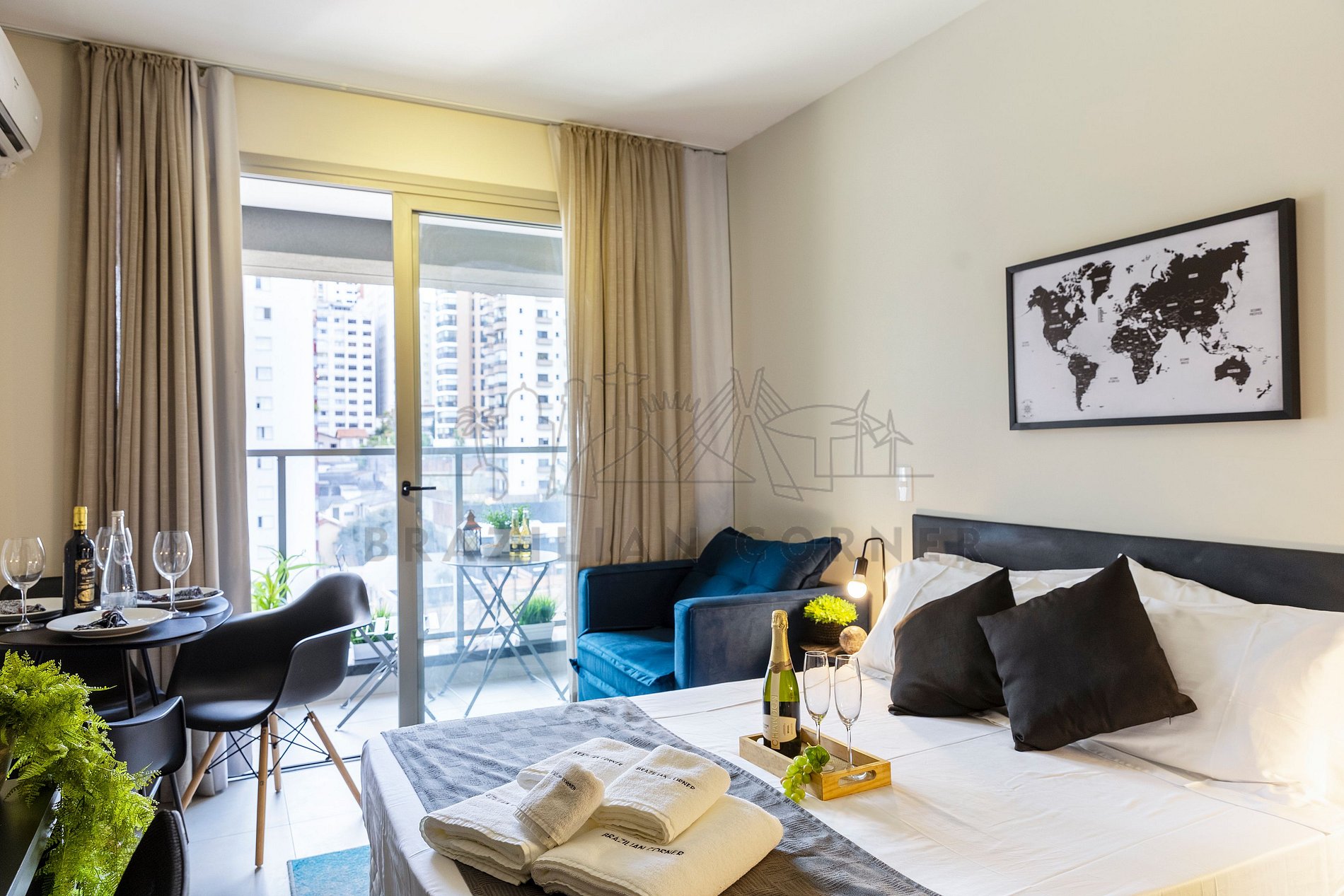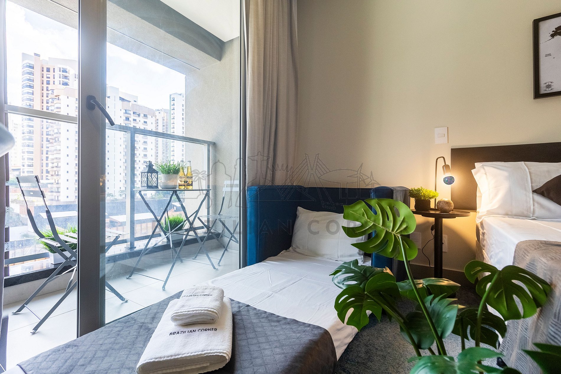 O moderno estúdio de 24m² fica próximo ao Allianz Parque, a só 750m de distância. O imóvel conta com uma ótima varanda, cortina blackout, sofá cama e cama de casal, uma TV de 40", ar condicionado e internet ultra-veloz. A cozinha possuí todos os utensílios necessários para uma estadia completa, além de contar com um ótimo chuveiro a gás. O prédio oferece lavanderia, mercadinho 24h, espaço pet e coworking. Próximo ao estúdio há uma SmartFit (110m), Hospital Albert Einstein (50m), e muito mais.