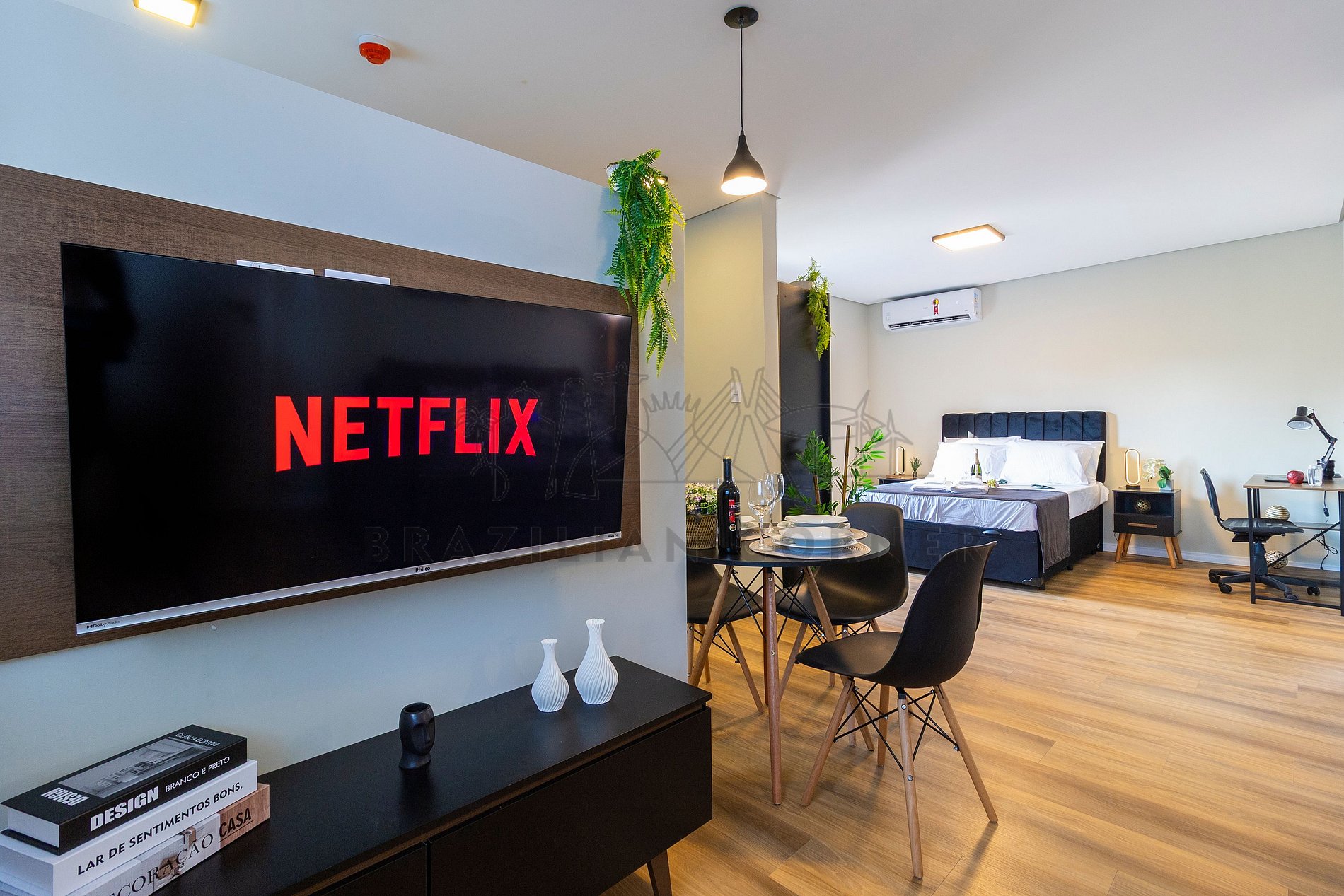O estúdio é ideal para uma temporada na cidade, seja a lazer ou a trabalho. Conta com ar-condicionado, varanda charmosa, cama confortável, internet de alta velocidade, Smart TV, blackout para garantir boas noites de sono, além de uma cozinha completa com eletrodomésticos e utensílios para quem gosta de cozinhar.
